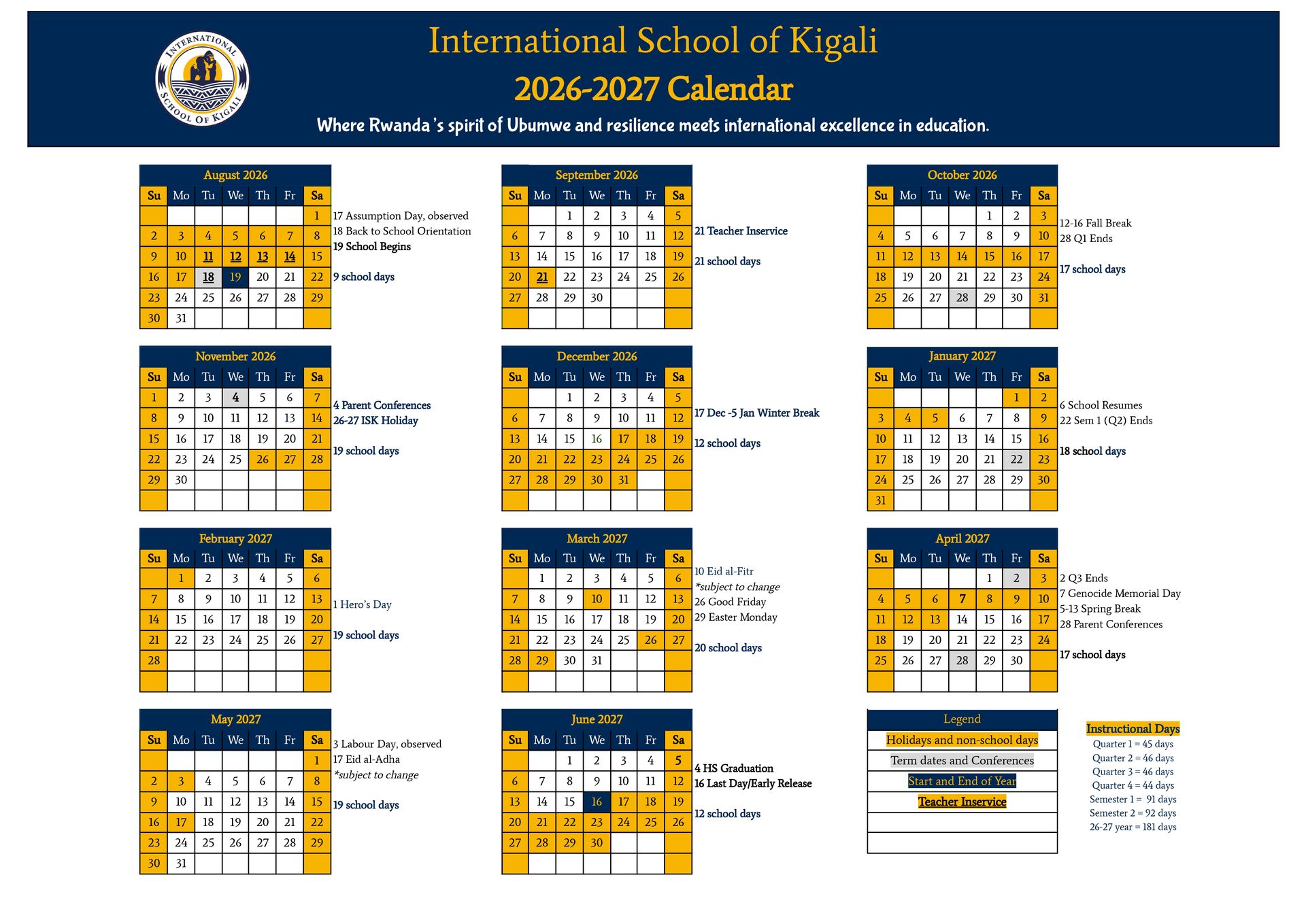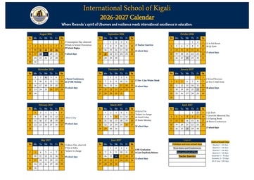 The academic year at the International School of Kigali is structured into two semesters and four quarters, ensuring a balanced schedule for students' learning. Across the year, there are 182 instructional days with regular breaks to support rest and rejuvenation.